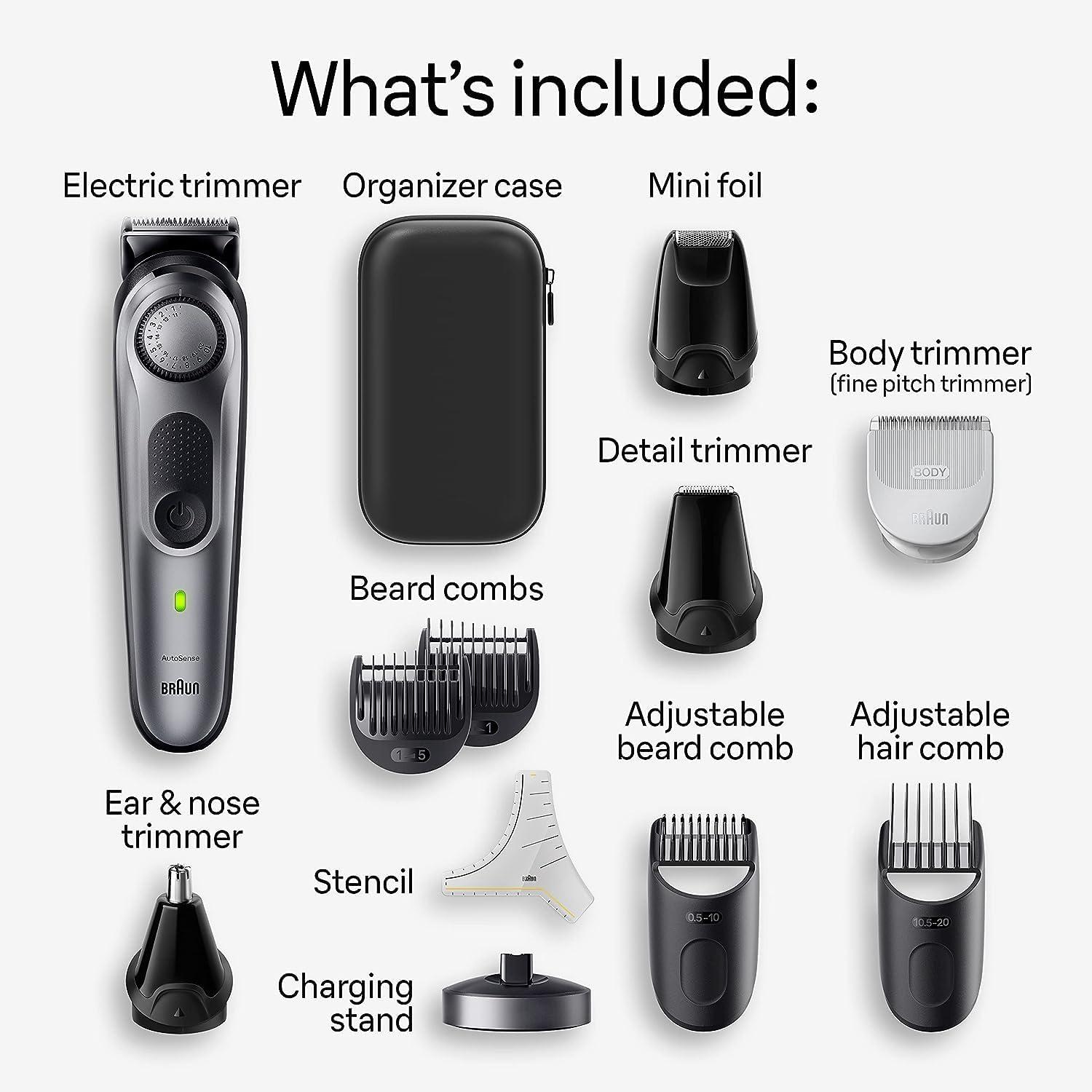 Braun All-in-One Men’s Shaving Kit Series 7 7440, 12-in-1 Beard, Face, Nose, Ear Trimmer, Hair Clippers, Body Groomer and Manscaping + Travel Case + Charging Stand(Silver)