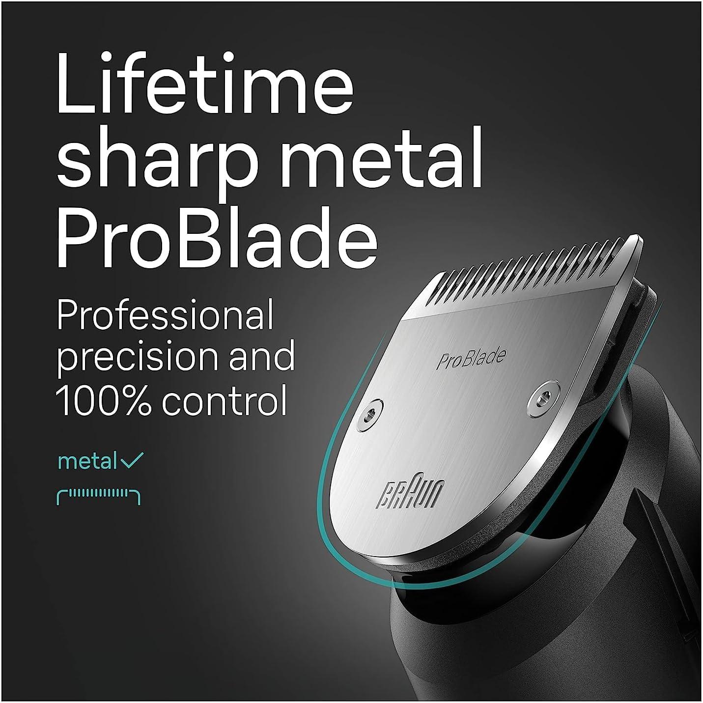 Braun Series 7 All-In-One Style Kit. For versatility and precision at home. With a beard, ear & nose trimmer, hair clippers and body groomer. Features the Precision Wheel with 40 length settings and our sharpest ProBlade. 100-minute cordless runtime. Includes: ProBlade trimmer head, body groomer head, precision beard (0.5 mm – 10 mm) & hair (10.5 – 20 mm) combs, beard fading combs, ear & nose trimmer head, detail trimmer head, contour pro head, mini foil shaver, charging stand, beard stencil, organizer case. Box Content 1x trimmer device incl. problade trimmer head 1x Body groomer head 1x Precision beard comb (0.5 mm – 10 mm) 1x Precision hair comb (10.5 – 20 mm) 1x Beard fading comb 1x Ear & nose trimmer head 1x Detail trimmer head 1x Contour pro head 1x Mini foil shaver 1x Cleaning brush 1x Charging stand 1x Beard stencil 1x Organizer case