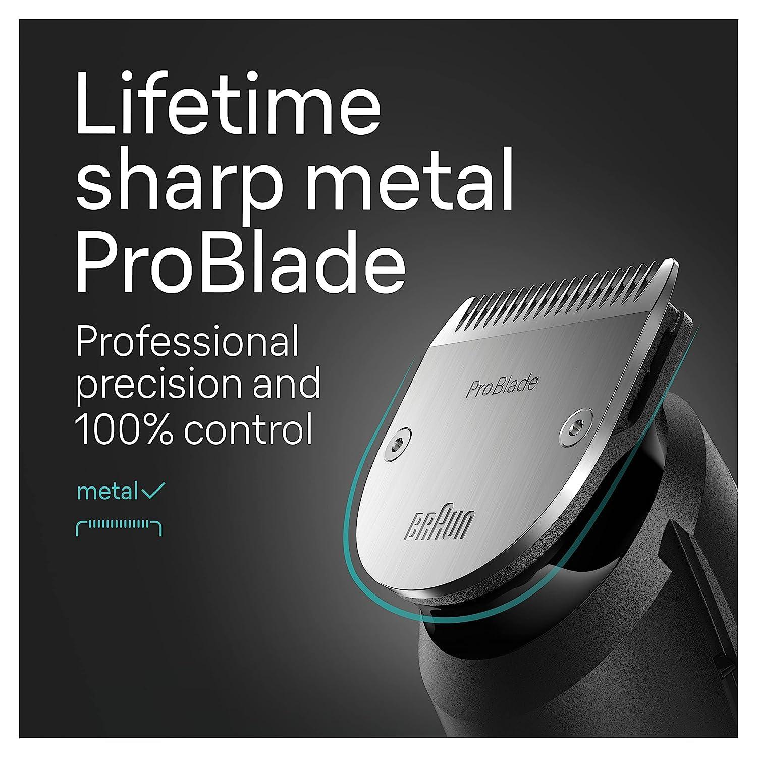 Braun Series 7 All-In-One Style Kit. For versatility and precision at home. With a beard, ear & nose trimmer, hair clippers and body groomer. Features the Precision Wheel with 40 length settings and our sharpest ProBlade. 100-minute cordless runtime. Includes: ProBladetrimmer head, fine pitch head, precision beard (0.5 mm – 10 mm) & hair (10.5 – 20 mm) combs, beard fading combs, ear & nose trimmer head, detail trimmer head, mini foil shaver, charging stand, beard stencil, organizer case. Box Content 1x Trimmer device incl. ProBlade trimmer head 1x Body groomer head 1x Precision beard comb (0.5 mm – 10 mm) 1x Precision hair comb (10.5 – 20 mm) 1x Beard fading combs 1x Ear & nose trimmer head 1x Detail trimmer head 1x Mini foil shaver 1x Cleaning brush 1x Charging stand 1x Beard stencil 1x Organizer case