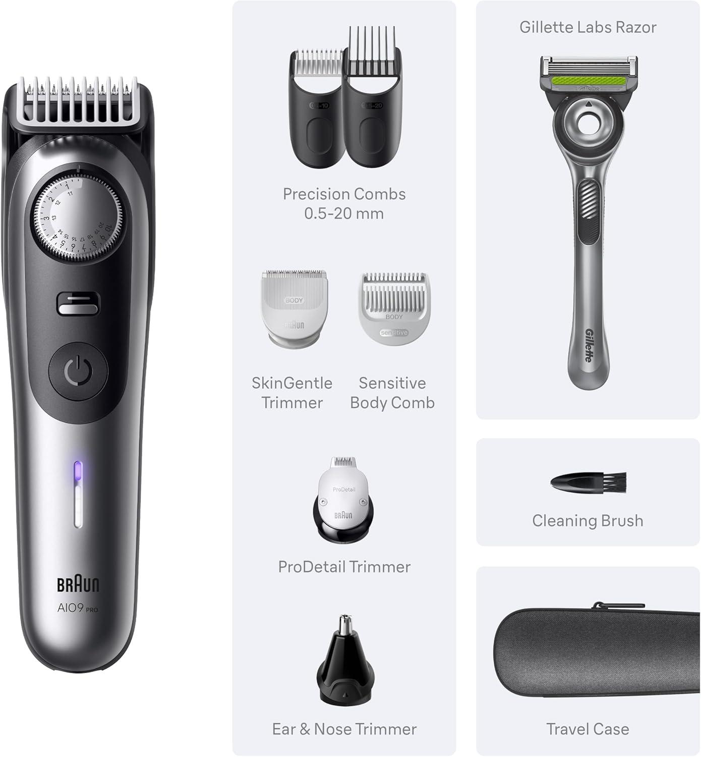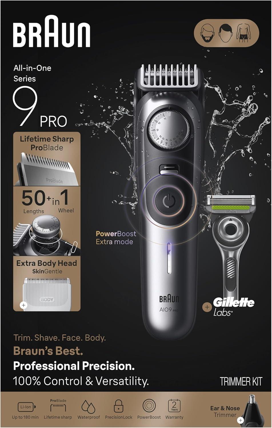 Professional Precision: Braun’s Best All-in-One Trimmer Kit, the Braun Series 9 PRO gives you 100% control and versatility – This men's grooming kit includes curated body hair groomers for beard, hair, ear and nose trimming, and manscaping your whole body