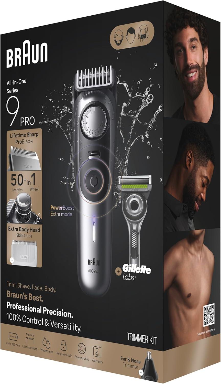 Braun’s Best All-in-One Series 9 PRO Trimmer Kit lets you effortlessly trim your beard, hair, ears and nose, and groom your whole body. AutoSense Technology reads beard density and adjusts the shaver's power to ensure a consistent and powerful cut, even on dense beards. PowerBoost mode adds even more trimming power to your shave, and the Lifetime Ultra Sharp ProBlade captures tricky hairs. A precision switch locks the shaver head to give you even more control for navigating tricky areas. This Braun trimmer features PrecisionLock and 50+ lengths in 0.25 mm steps to provide the ultimate control and fine-tuning of your look. The detachable Precision ProTrimmer shapes sideburns and mustaches with pinpoint accuracy. Engineered in Germany and designed for durability, this 100% waterproof rechargeable trimmer thrives in wet or dry conditions and is compatible with foam or gel to give you an ultra close shave in or out of the shower, and the Li-ion battery provides a long-lasting charge that keeps the trimmer ready when you need it. Braun All-in-One Series 9 PRO beard trimmer kit includes versatile tools to trim, shave, edge and detail, enabling you to achieve perfect lines and finishes.