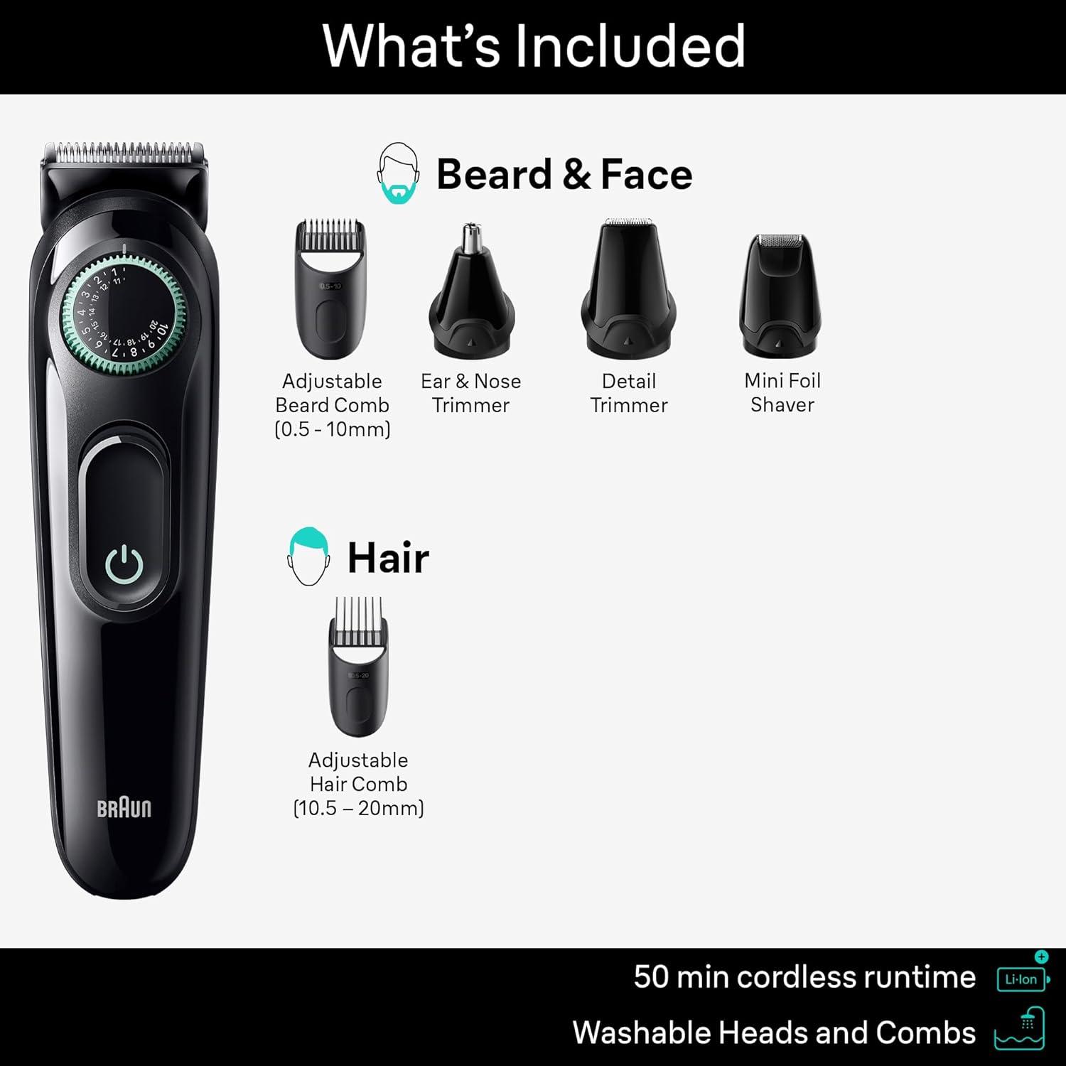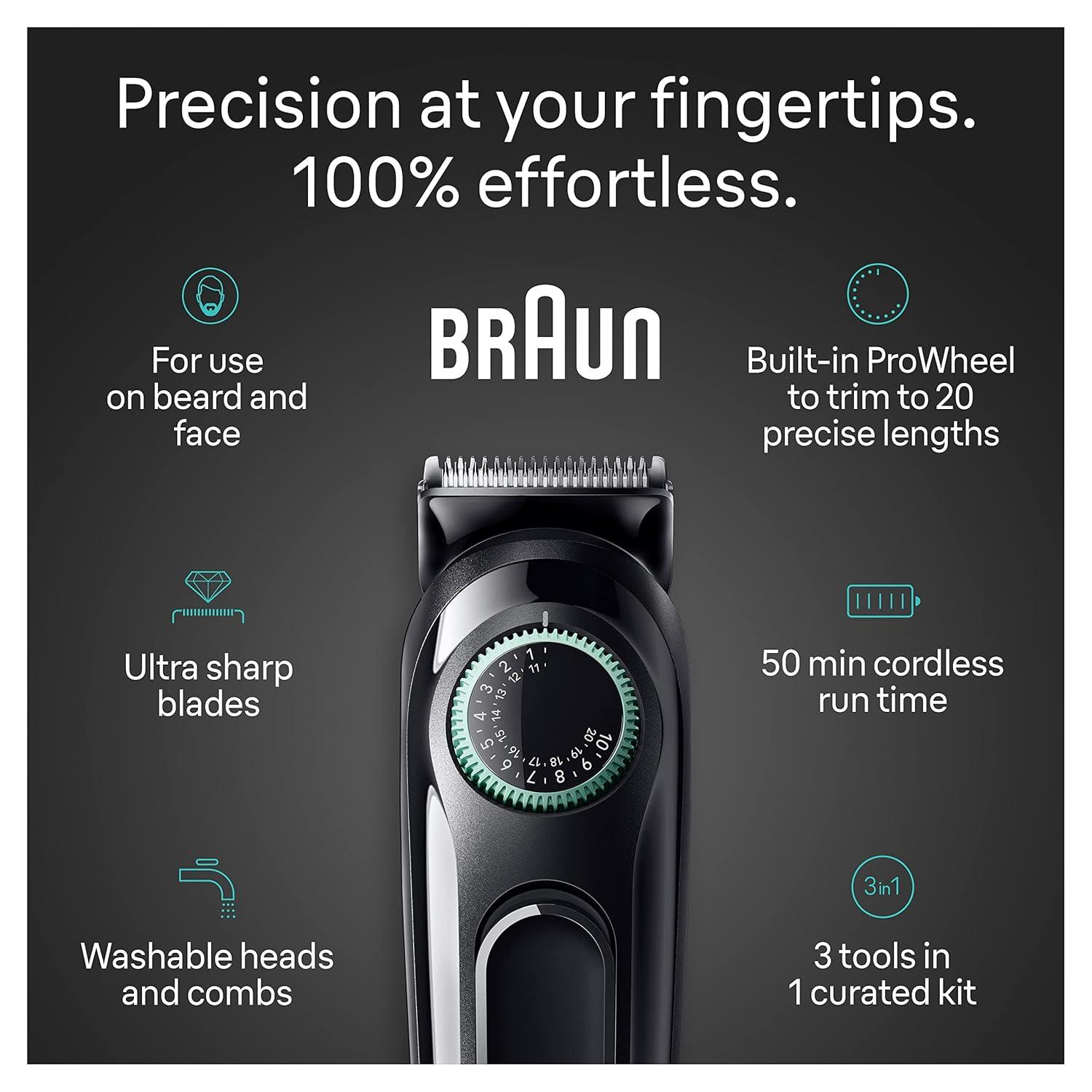 Braun Series 3 All-In-One Style Kit. For versatility and precision at home. With a beard, ear & nose trimmer. Features the Precision Wheel with 20 length settings and ultra sharp blades. 50-minute cordless runtime. Includes: Plastic trimmer head, precision beard (0.5 mm – 10 mm) comb, ear & nose trimmer head, USB charger. Box Content 1x Trimmer device incl. plastic trimmer head 1x Precision beard comb (0.5 mm – 10 mm) 1x Ear & nose trimmer head 1x Cleaning brush 1x USB charger