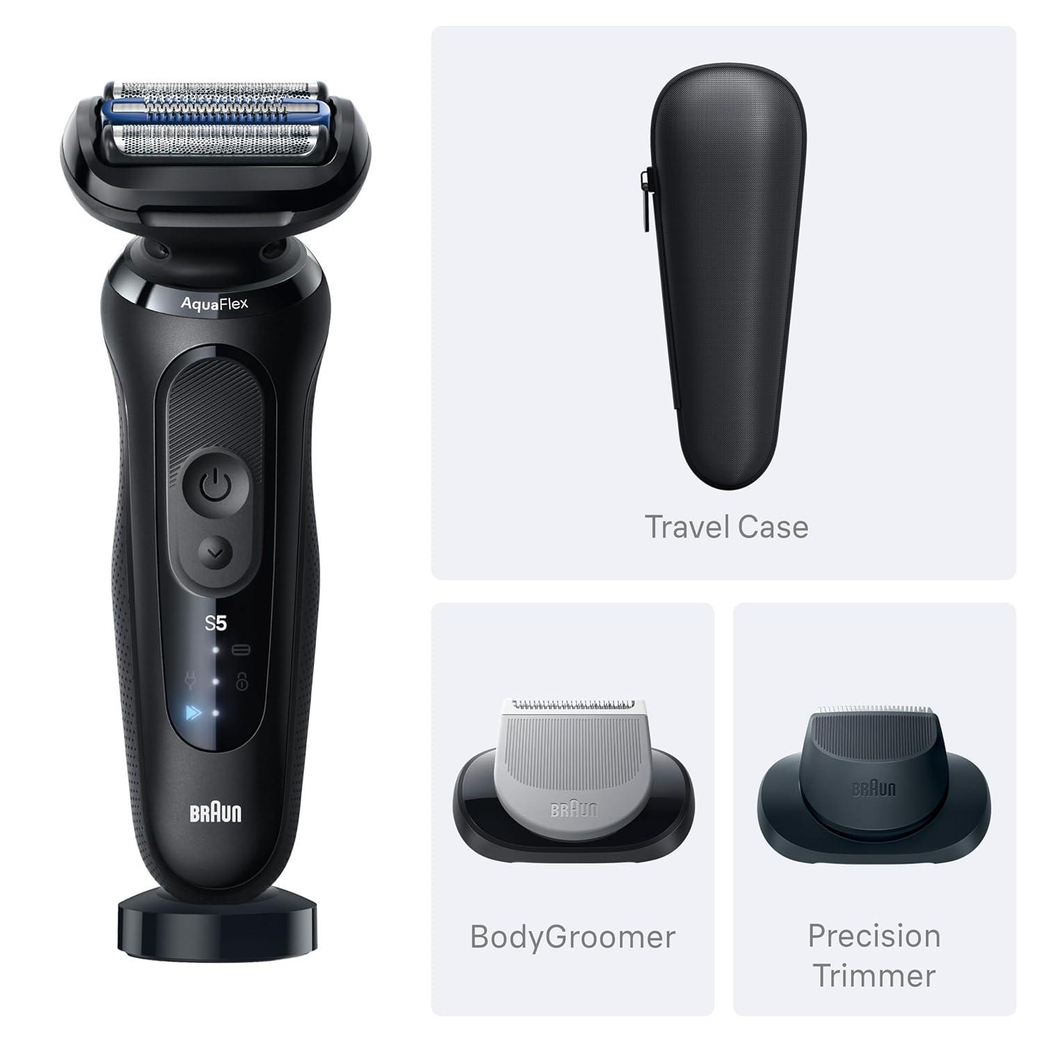 Braun’s Beard Shaver Series 5 offers a fast, easy & protective shave, ideal for daily grooming. The 3 AquaFlex Blades adapt to facial contours for a close, clean shave. SmartMotor adjusts to beard density, while SkinGentle Foil and SmoothShave Blade protect skin and cut longer hairs in fewer strokes. With EasyClean and Wet & Dry use, it offers up to 50 minutes of cordless runtime. Includes Precision Trimmer, Body Groomer, Charging Stand and travel pouch.