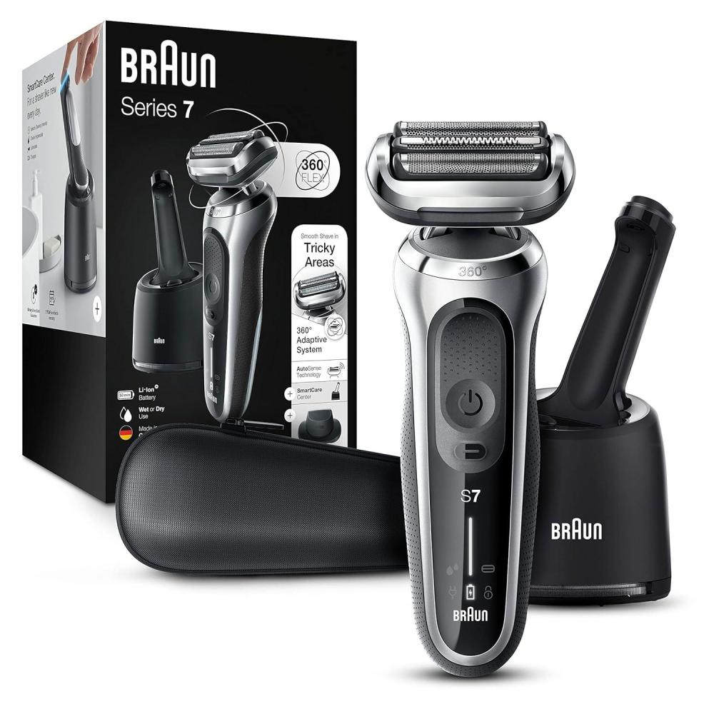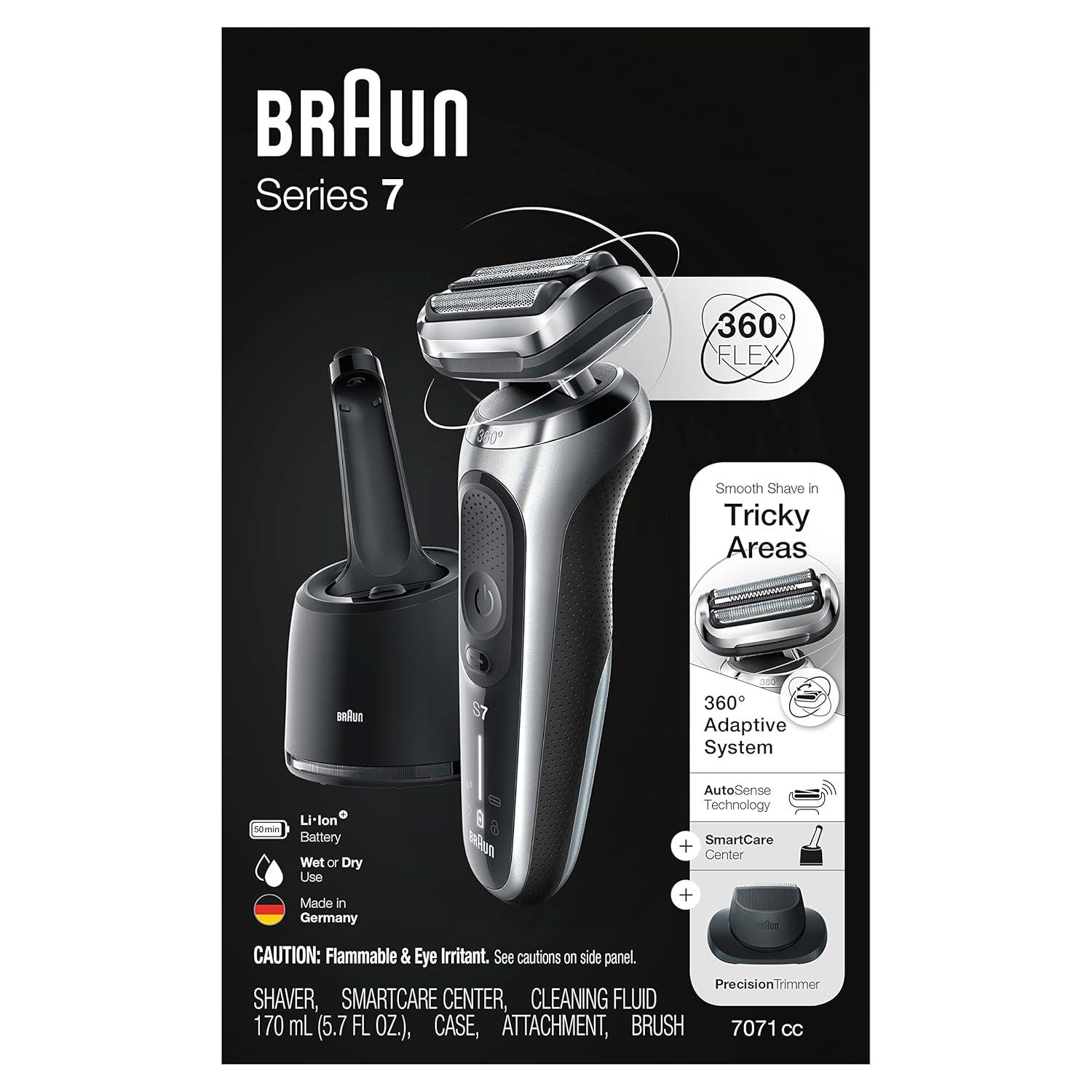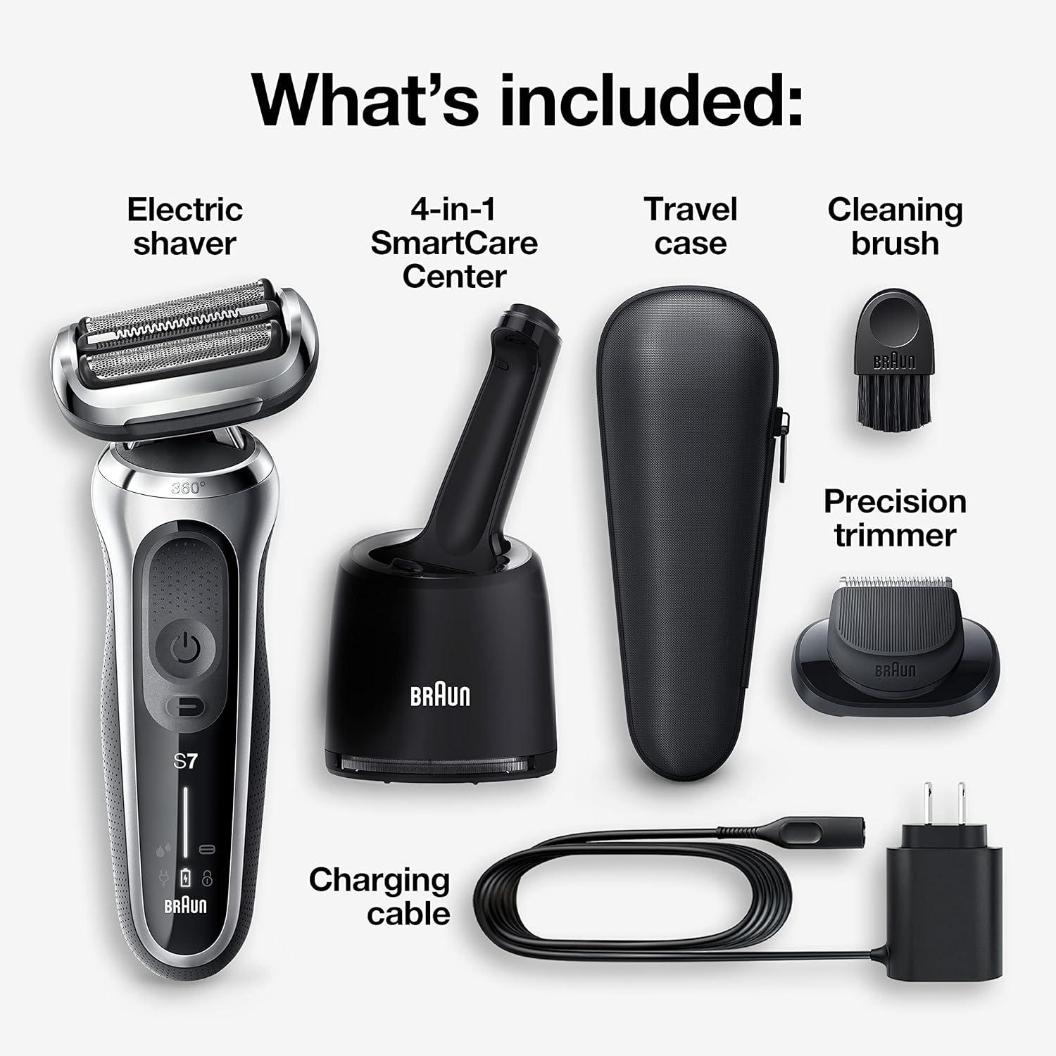 Braun Series 7 7171cc electric shaver for men delivers a close shave faster, thanks to the floating 360° Flex Head that adapts to your contours for an extremely close shave, even in tricky areas. To easily customize your shave, select Turbo mode for an extra fast shave, Gentle mode for a gentle shave on sensitive skin, or Standard mode for a balanced shave. Easily upgrade your shaver with different attachments for all your grooming needs. Includes a SmartCare center for a shaver like new, every day. Made to adapt to your shaving needs, this waterproof electric shaver features AutoSense technology that adjusts power to your beard density. The men’s shaver is made in Germany for guaranteed quality. Box includes: 1x Series 7 shaver, SmartCare Center, Cleaning Brush, Precision Trimmer and pouch.