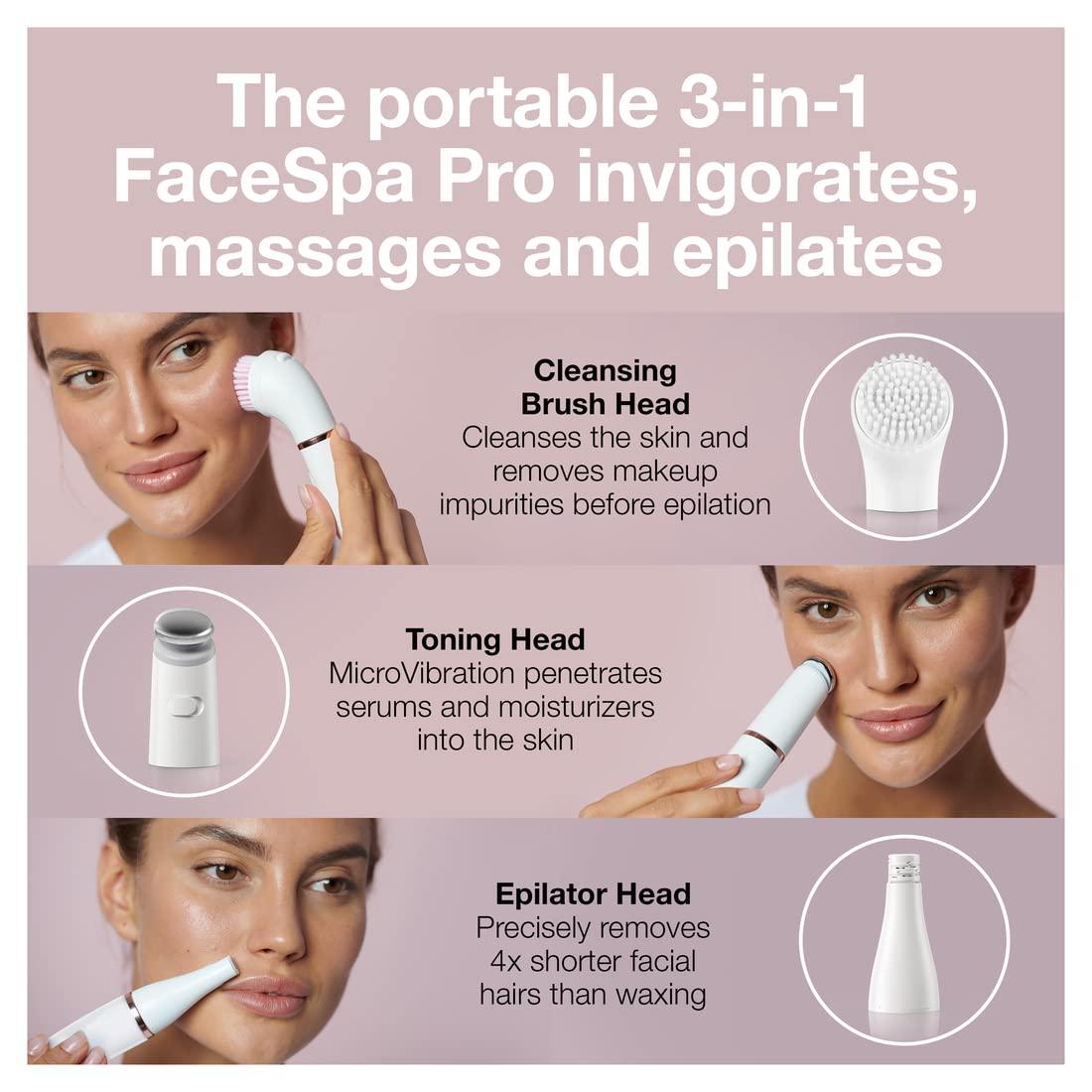 The Braun FaceSpa Pro is the World's 1st 3-in-1 facial epilation, cleansing & skin toning device. Gently remove facial hair by the root with the epilator attachment for long-lasting smooth skin. The facial cleansing brush removes make-up while the MicroVibration head works with your serum or cream for skin-toning effects.**Better application of your skin care product vs manual