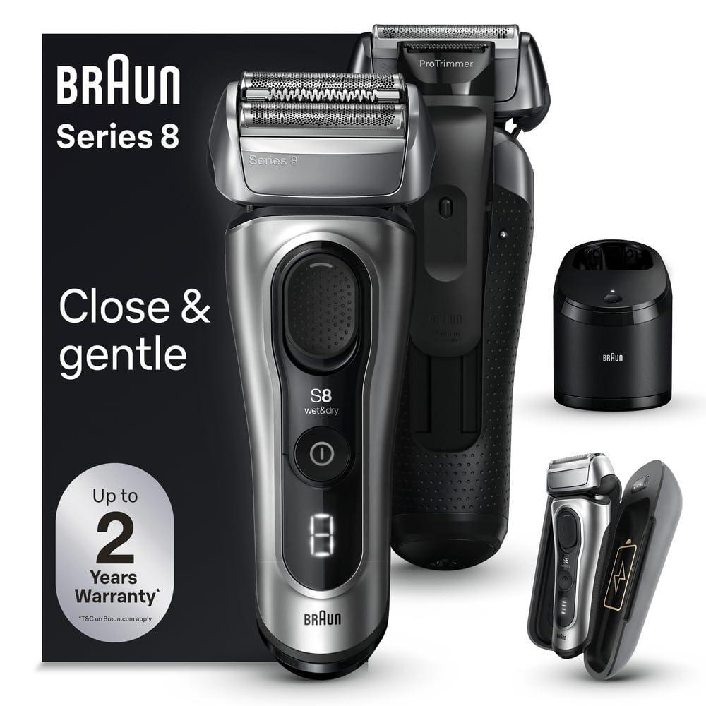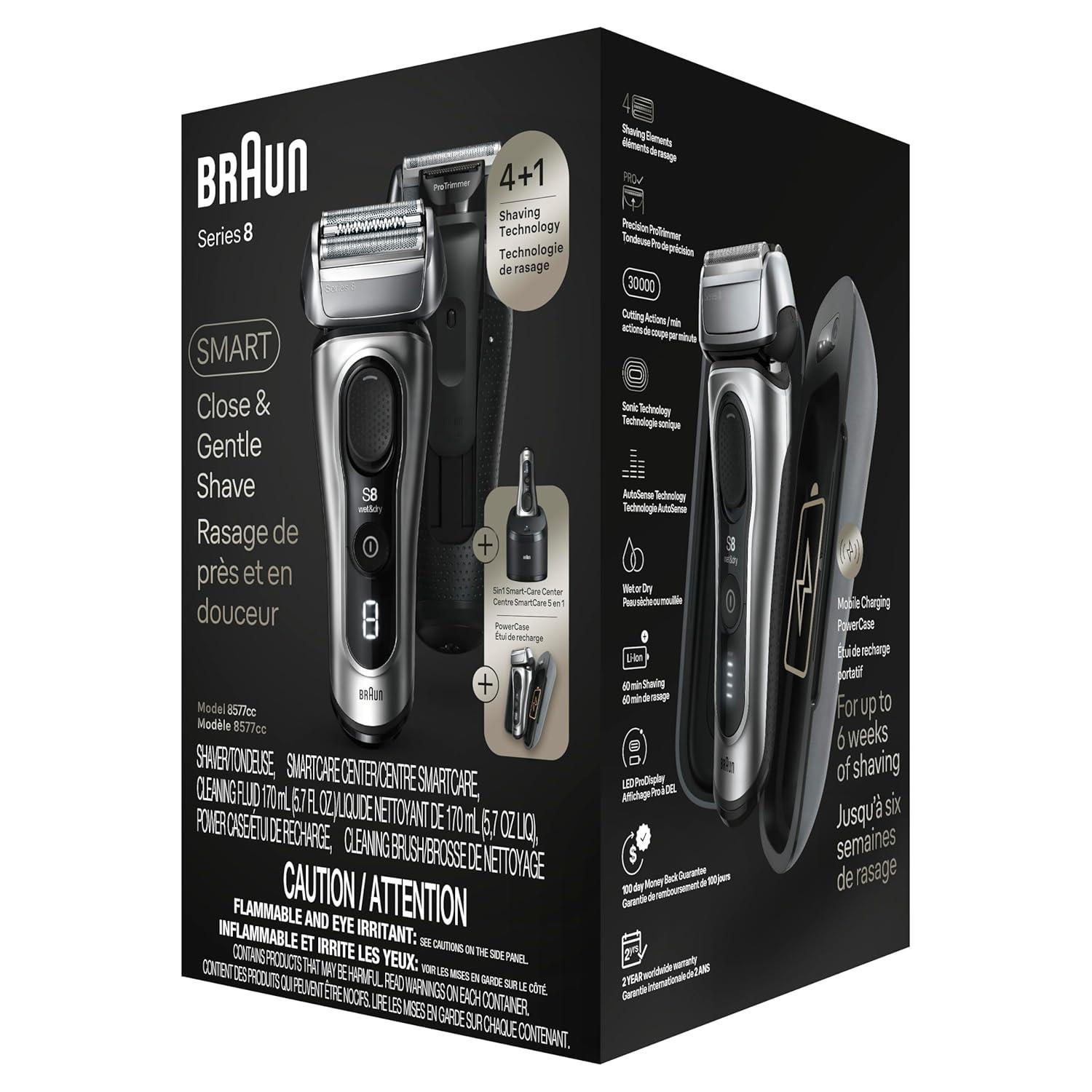 INCLUDES: Braun Series 8 8577cc Men's Electric Shaver with built-in Precision Trimmer, 5-in-1 SmartCare Center, Mobile Power Case, and Cleaning Brush