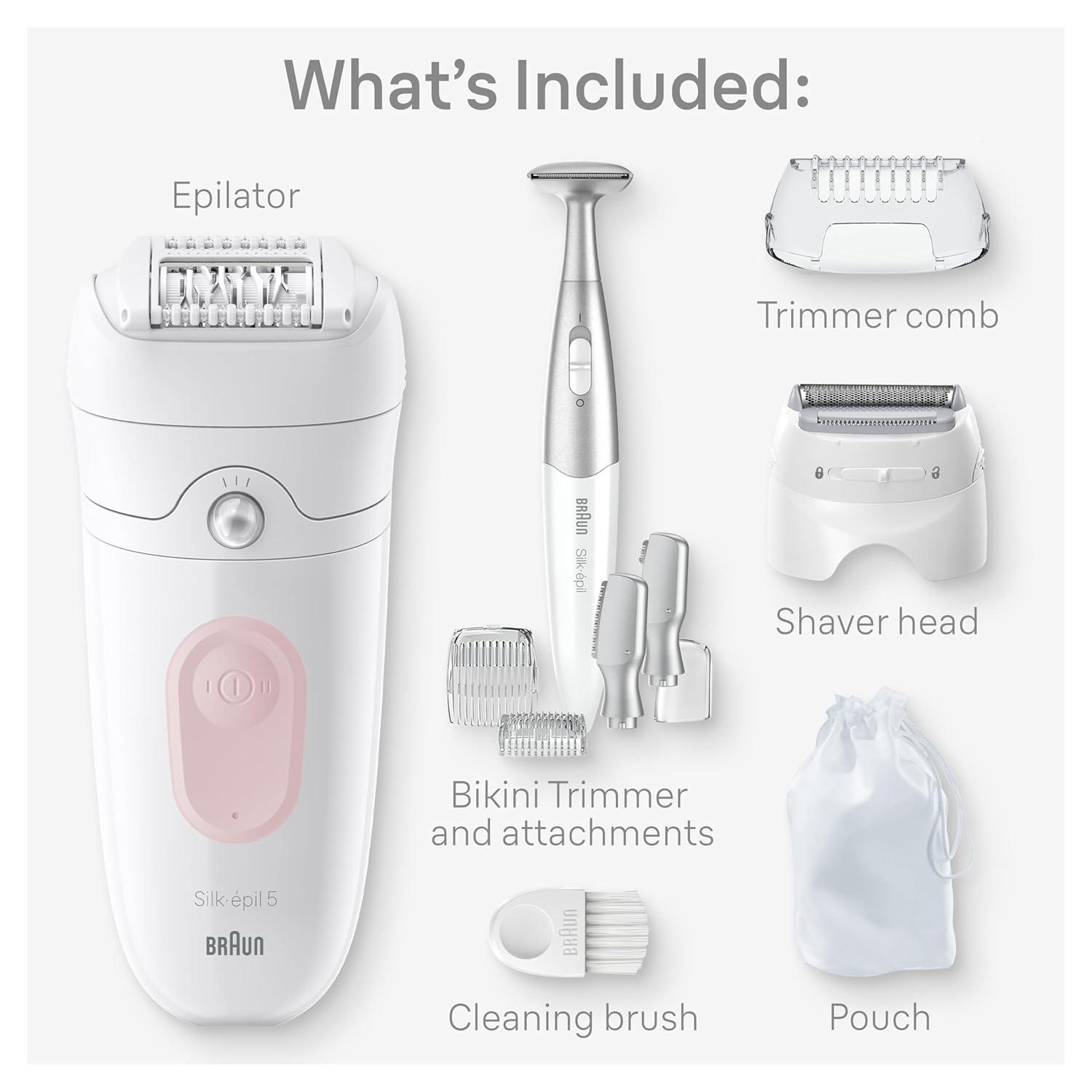INCLUDES: SE5 Epilator, Bikini trimmer and attachments, Trimmer comb, Shaver head, Cleaning brush and Pouch