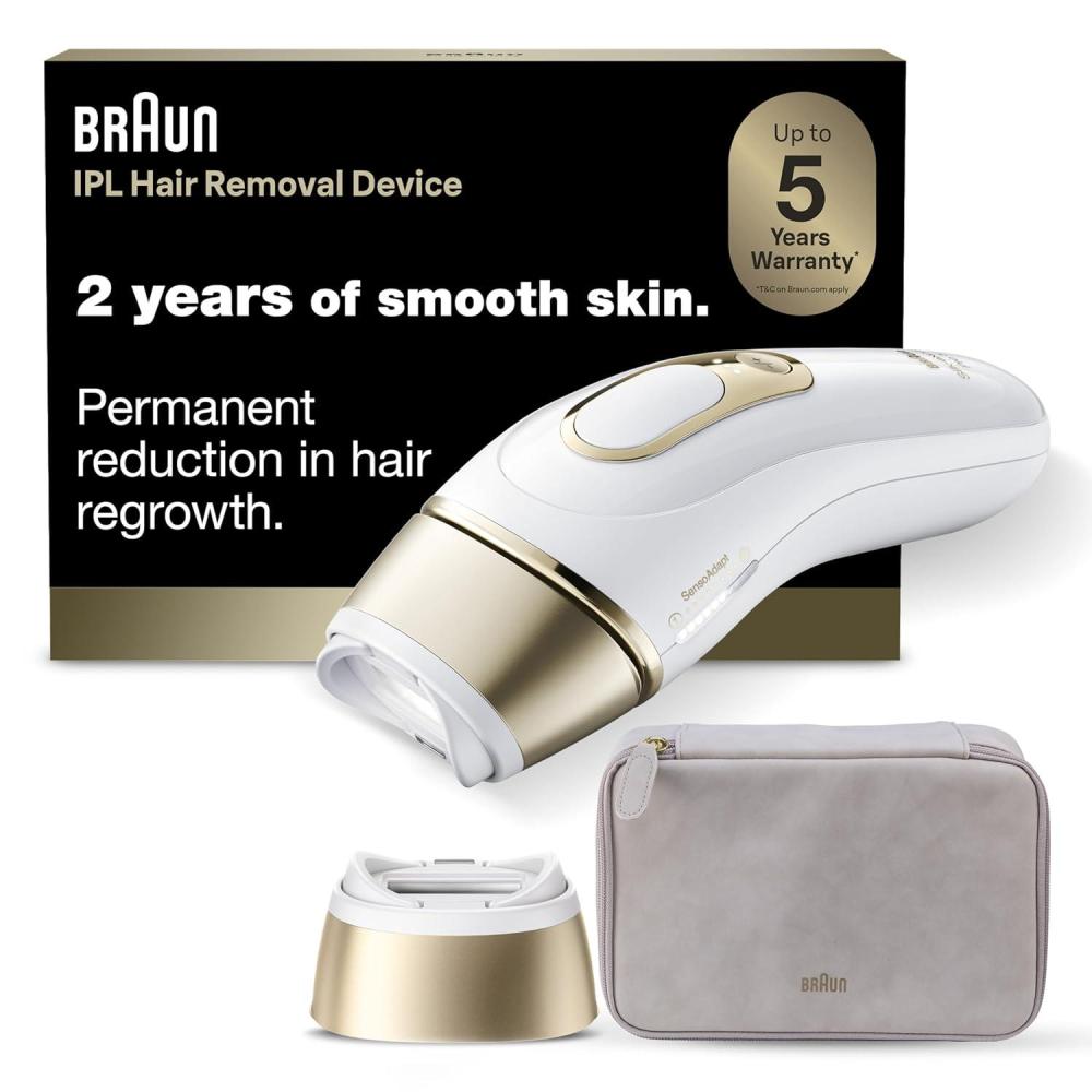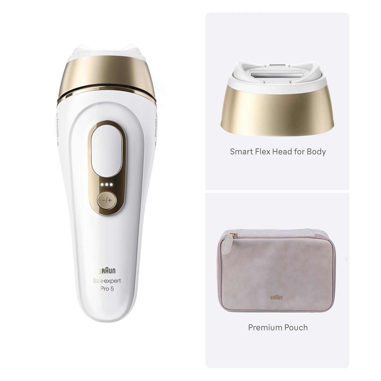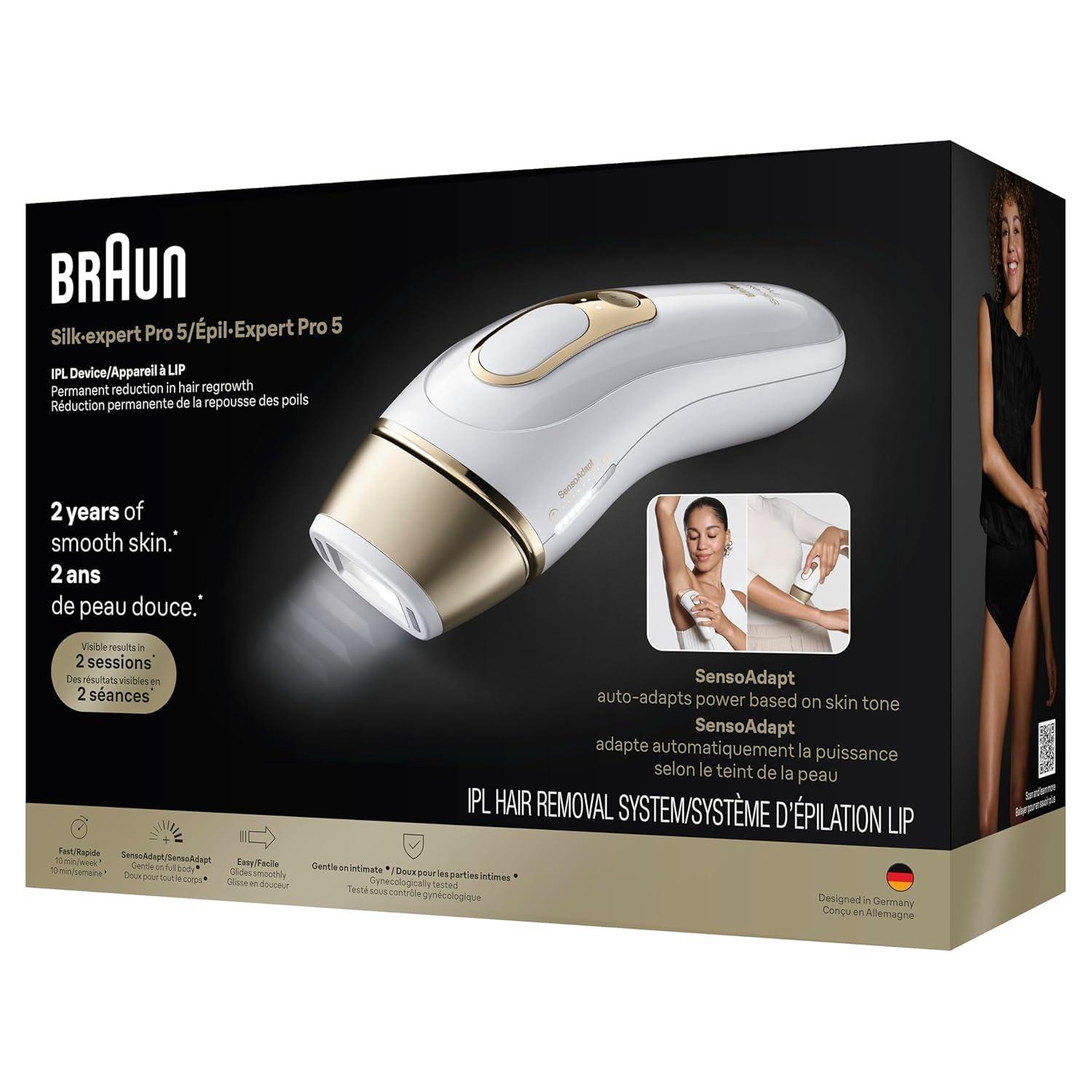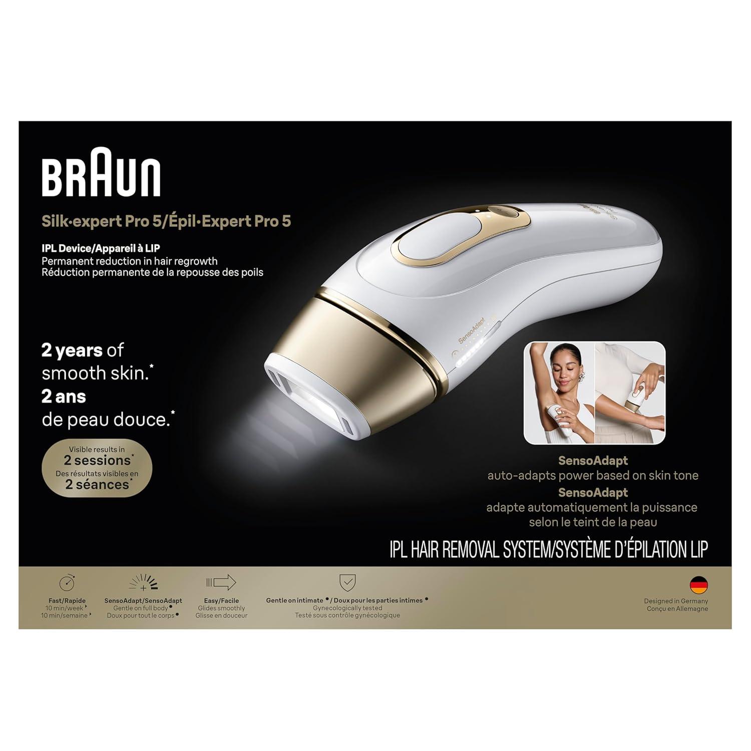 Discover the Braun Silk-Expert Pro 5 IPL at home laser device for effective and gentle hair removal. Revolutionizing laser hair removal, the Braun IPL uses cutting-edge technology tailored to your unique skin tone and hair type for safe, effective results. The Silk Expert Pro 5 features a skin tone sensor that automatically adjusts each flash for safe, eye-safe treatments, eliminating the need for protective glasses. Clinically proven to deliver visible hair reduction from the first session**, this facial hair removal for women requires two sessions per month for three months****, making it highly efficient. Designed for versatility, the Braun IPL Pro 5 includes sensitive, balanced, power settings and specialized attachments for facial, body, and bikini hair removal. Its ergonomic Smart Flex Head ensures 100% coverage, even in tricky areas, while the real-time coverage tracker prevents missed spots. Dermatologically and gynecologically tested, this IPL hair removal device is safe for all body parts. Enjoy up to two years* of silky, hair-free skin with permanent hair regrowth reduction.*Following recommended regimen, individual results may vary.**Based on app data from consumer self-assessment (Nov'23-Apr'24) ***Legs (upper & lower), underarm, bikini, upper lip ****If additional touch-ups needed, refer to user manual for treatment regimen
